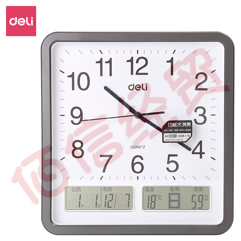 得力(deli)現(xiàn)代簡約創(chuàng)意掛鐘 萬年歷溫濕度顯示創(chuàng)意時鐘低噪音掛鐘 8823