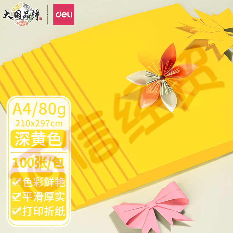 得力(deli)A4 80g黃色復(fù)印紙 彩色打印紙 兒童手工折紙剪紙彩紙 非硬卡紙 100張/包 7758 自營