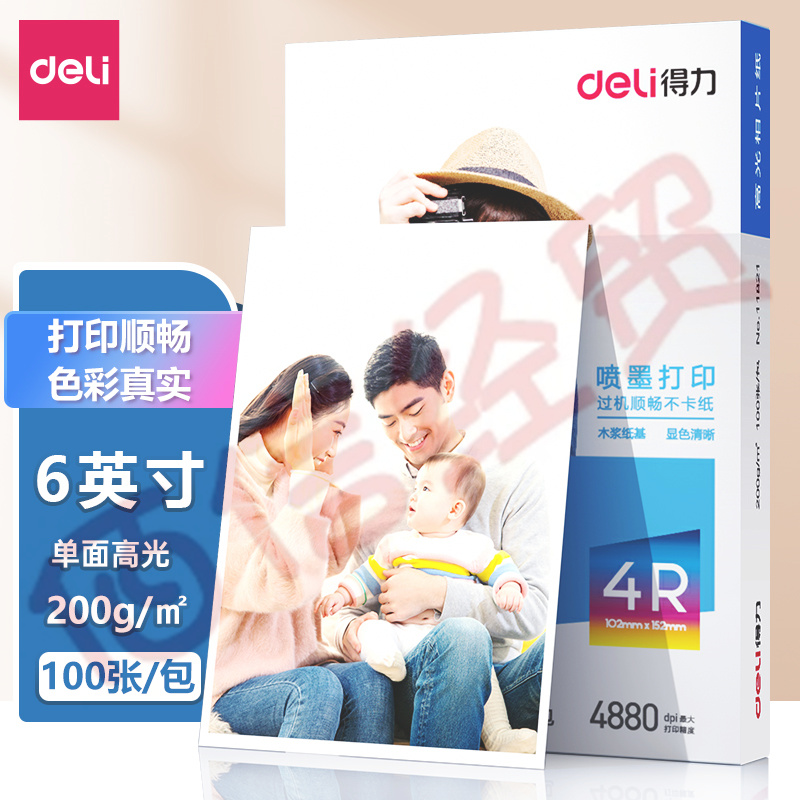 得力(deli)6英寸 200g高光面照片紙 相片打印紙 100張/包 11821 自營