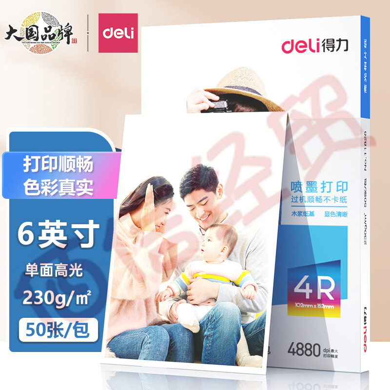 得力(deli)4R(6英寸) 230g高光面照片紙 相片打印紙 50張/盒 11828 自營