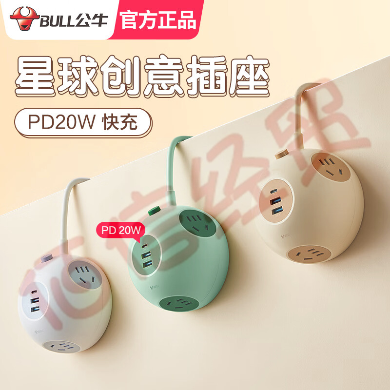 ¥121.20公牛(BULL)20W PD蘋果快充插座/插線板/插排/接線板 Type-c口+USB口+3位分控 全長1.8米 GNV-U1203F