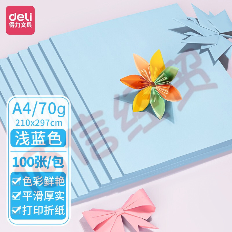 得力(deli)7391 復印紙 彩色打印紙 兒童手工折紙剪紙彩紙 非硬卡紙 A4 70g淺藍色 100張/包 自營