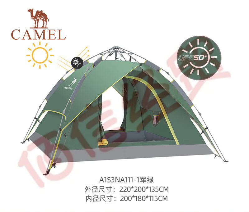 駱駝(CAMEL)【液壓帳篷】戶外露營自動彈開野餐便攜式折疊雙層防曬防雨3-4人 A111-1,軍綠(升級防曬版) 自營