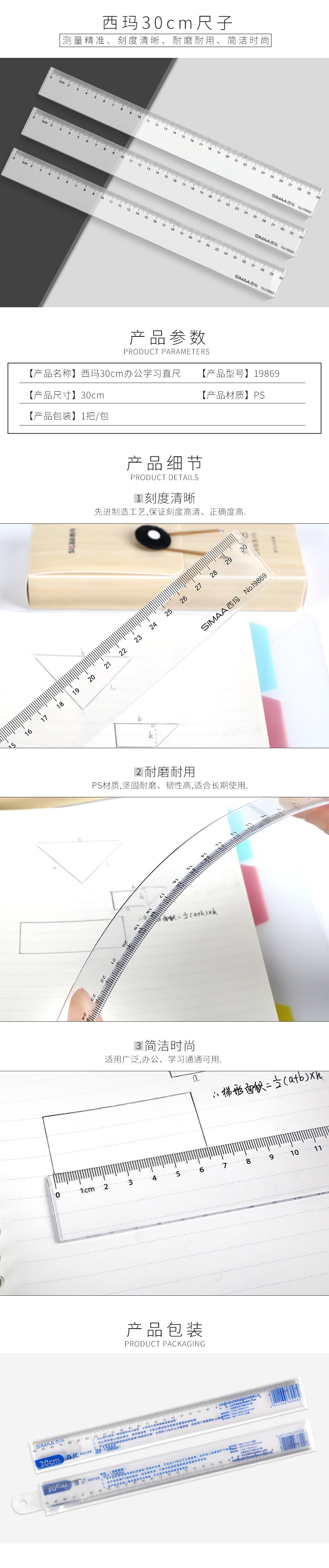 西瑪(SIMAA)30cm辦公尺子 學(xué)生文具繪圖直尺 19869(10個起售) 自營