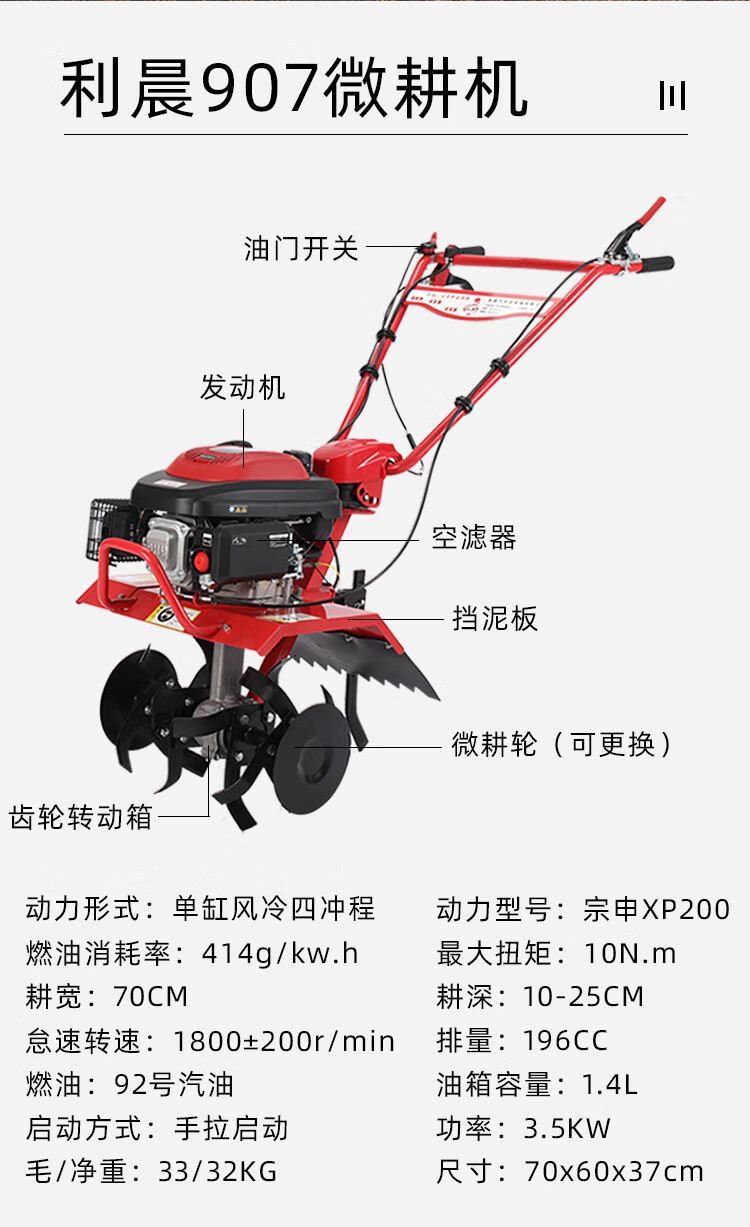 利晨宗申XP200汽油微耕機農用犁地翻土松土開溝機耕田翻地耕地旋耕機(907(XP200)+旋耕刀+輪胎) 自營