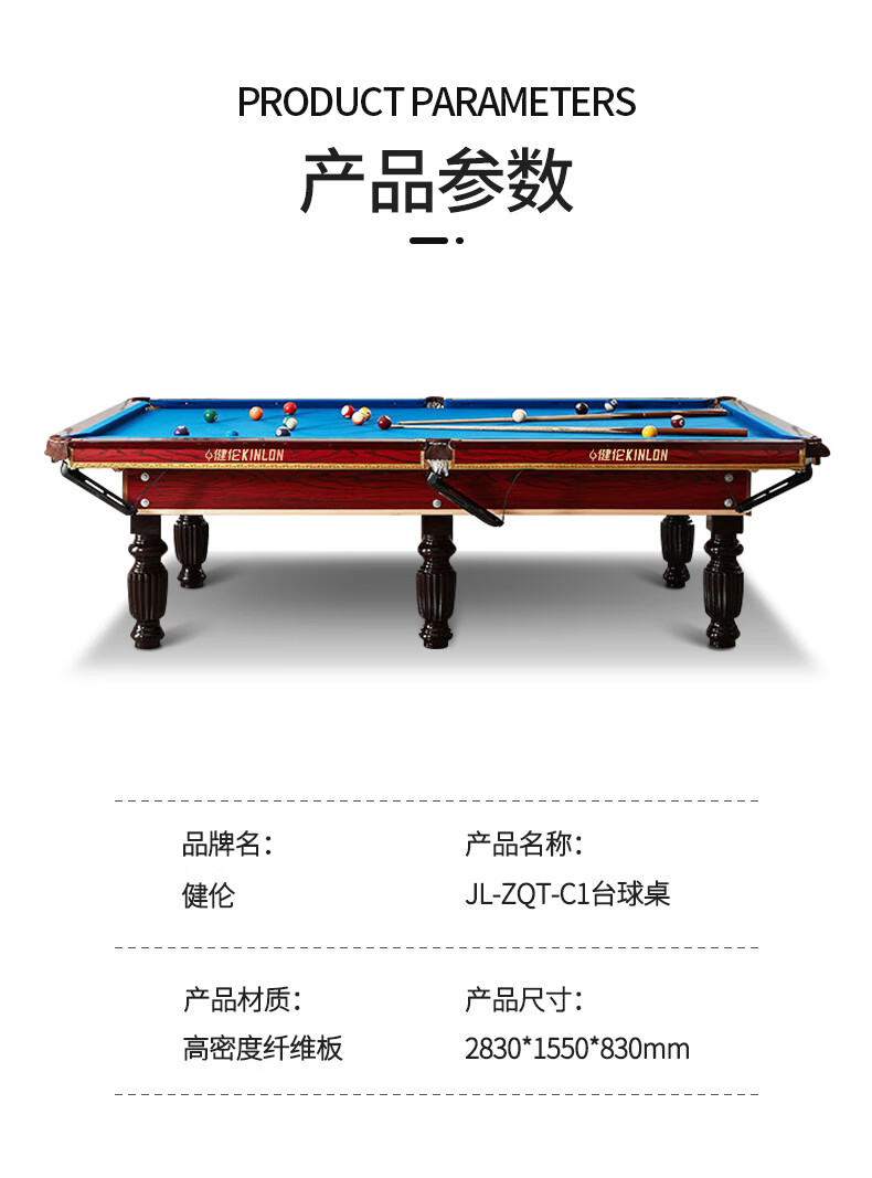 健倫(JEEANLEAN)JLAB134臺球桌高密度板 九尺家用高端美式黑八 高質(zhì)量采購款 自營