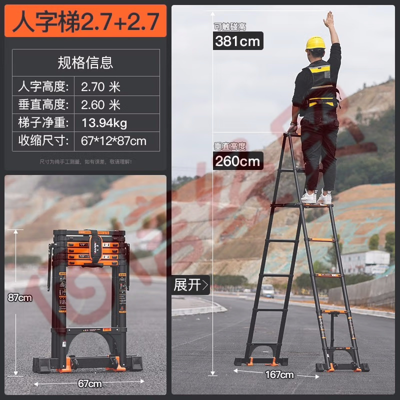 巴芬伸縮梯多功能梯子家用梯人字梯加厚鋁合金工程梯升降直梯折疊樓梯 人字梯2.7米【防滑加寬踏板】 自營
