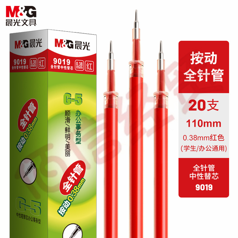 ■晨光0.38mm紅色中性筆替芯-- G-5全針管系列水筆芯 20支/盒9019C 自營